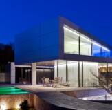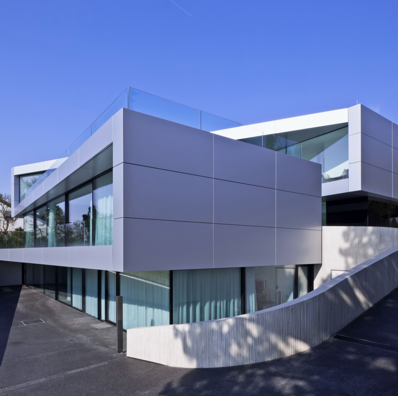 Die im Grundriss H-förmige, 3-geschossige Gebäudestruktur definiert den rückwärtigen, ruhigen Aussenbereich und talseitigen Garten mit Aussicht. Intensive Aussenbezüge in allen Ebenen mit boden-deckenbündiger Schiebefensterfassade.